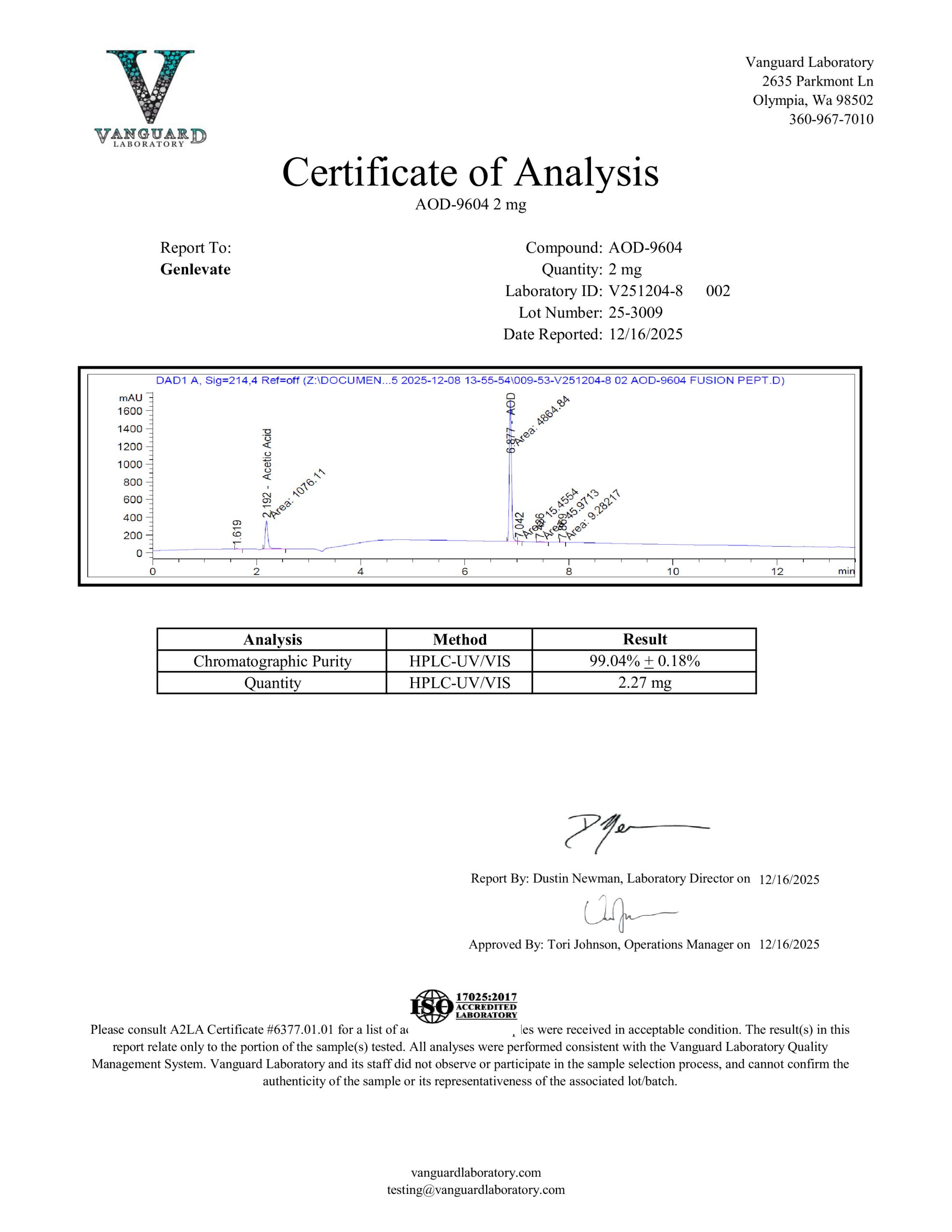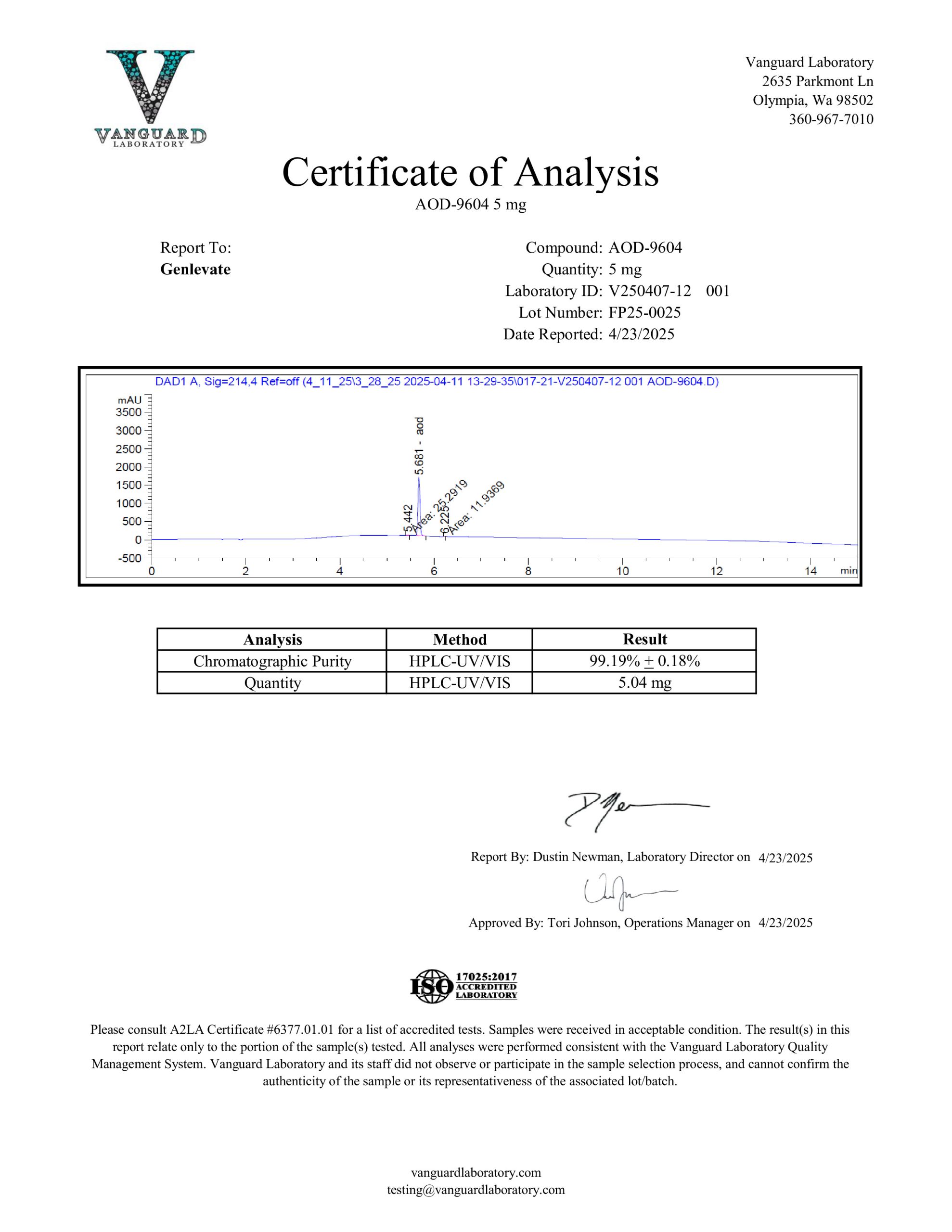 AOD-9604 is now available. Genlevate reviews every batch carefully because we ensure that each product is properly produced to include proper appearance and high purity.