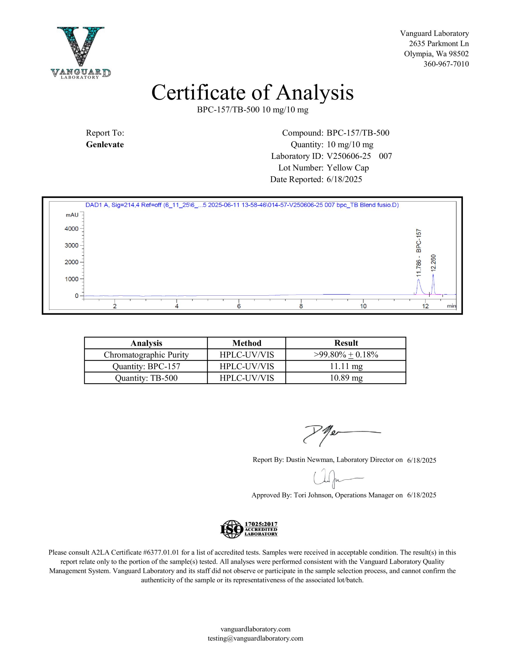 BPC-157/TB-500 Blend is now available. Genlevate reviews every batch carefully because we ensure that each product is properly produced to include proper appearance and high purity.