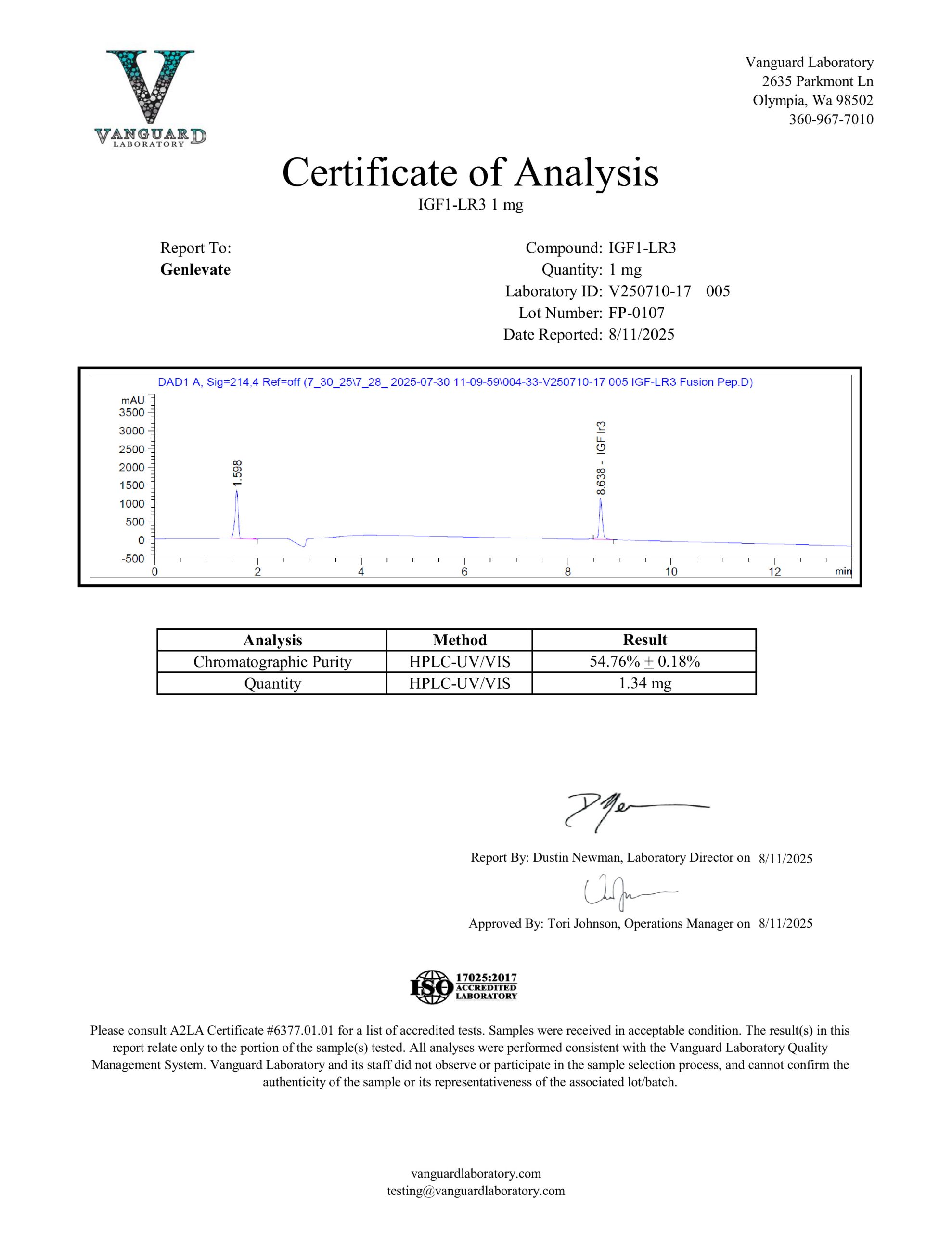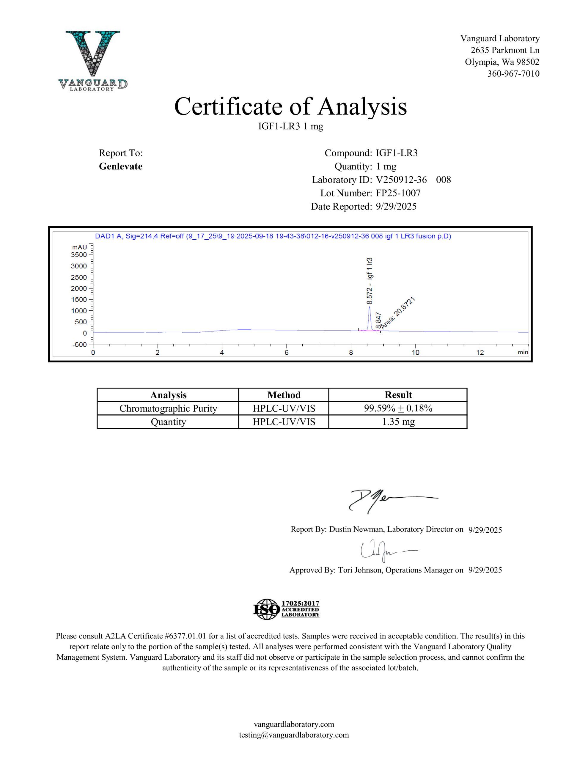 IGF-1 LR3 is now available. Genlevate reviews every batch carefully because we ensure that each product is properly produced to include proper appearance and high purity.