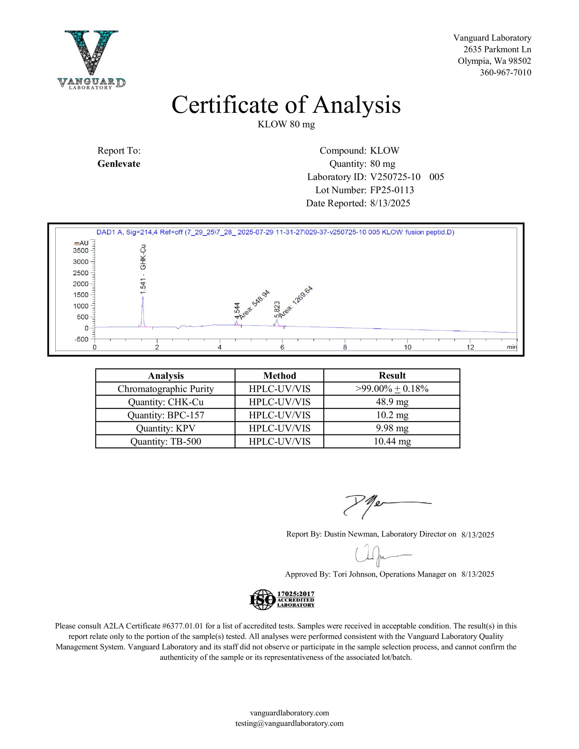 KLOW is now available. Genlevate reviews every batch carefully because we ensure that each product is properly produced to include proper appearance and high purity. Each vial contains the following: GHK-cu – 50mg, BPC-157 – 10mg, TB-500 – 10mg and KPV – 10mg for a total milligrams per vial of 80mg.