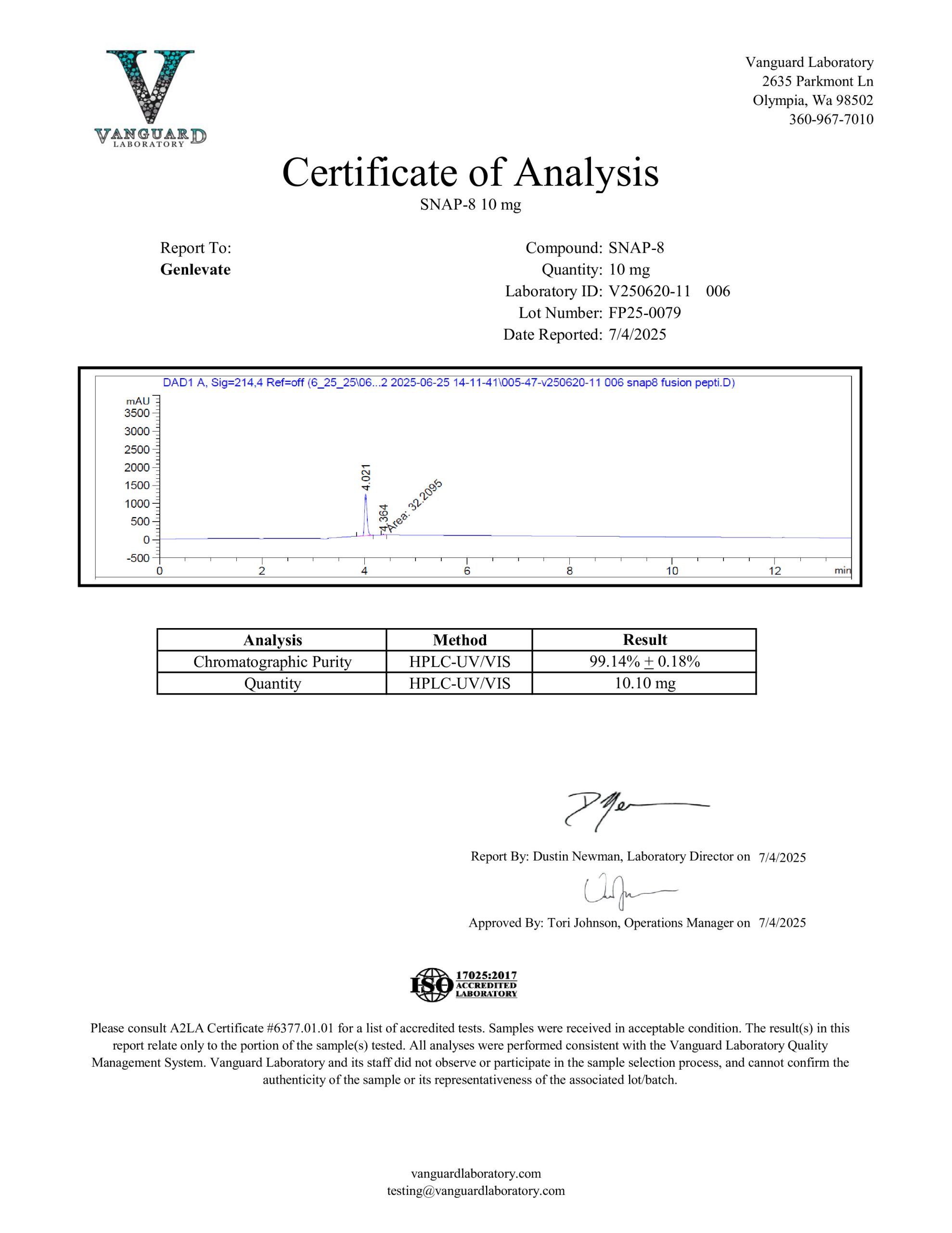 SNAP-8 is now available. Genlevate reviews every batch carefully because we ensure that each product is properly produced to include proper appearance and high purity.